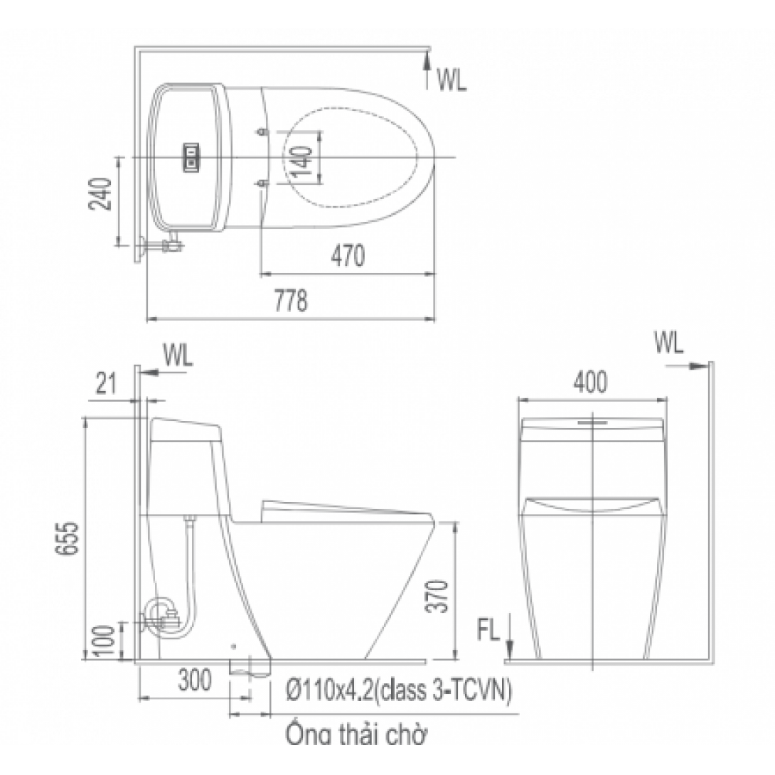 Bản vẽ bệ xí bệt Inax AC-909-1 xả nhấn nắp êm