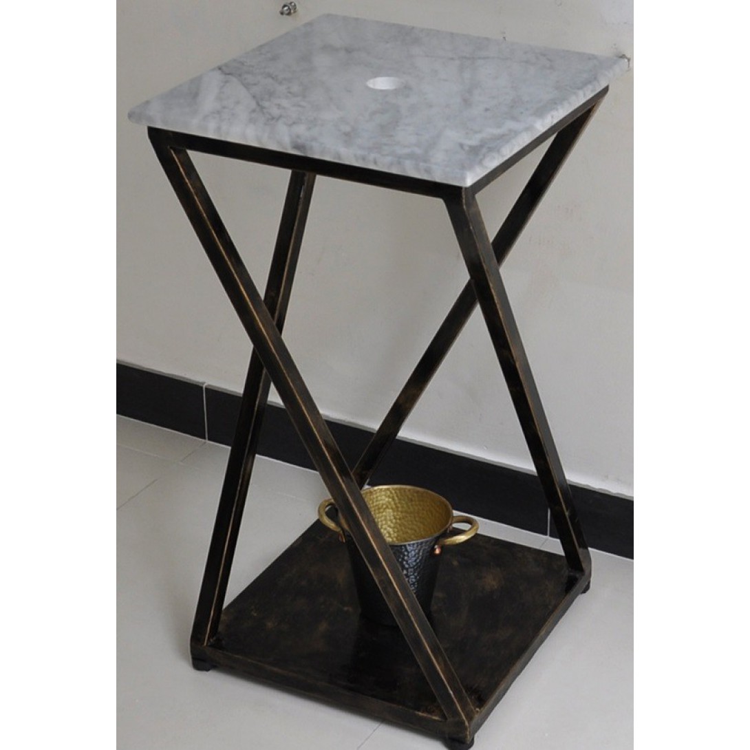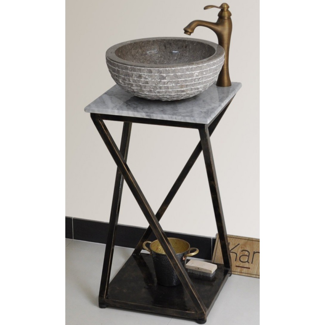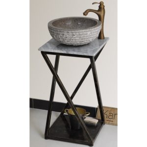 Khung sắt để lavabo, bệ để chậu rửa, chân sắt, kệ, giá đỡ để lavabo này được làm bằng sắt vuông sơn phủ màu đen, mặt đá tự nhiên nguyên tấm và thêm kệ tiện ít bên dưới có thể đặt để bình hoa hoặc bộ phụ kiện phòng tắm như mỹ phẩm, khăn tắm, bàn chải… Thiết bị được chế tác thiết kế phù hợp với các loại lavabo đơn, lắp nổi trên mặt bàn, các loại chất liệu lavabo sứ mỹ thuật, đá tự nhiên, kính, điều tương xứng phù hợp.