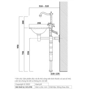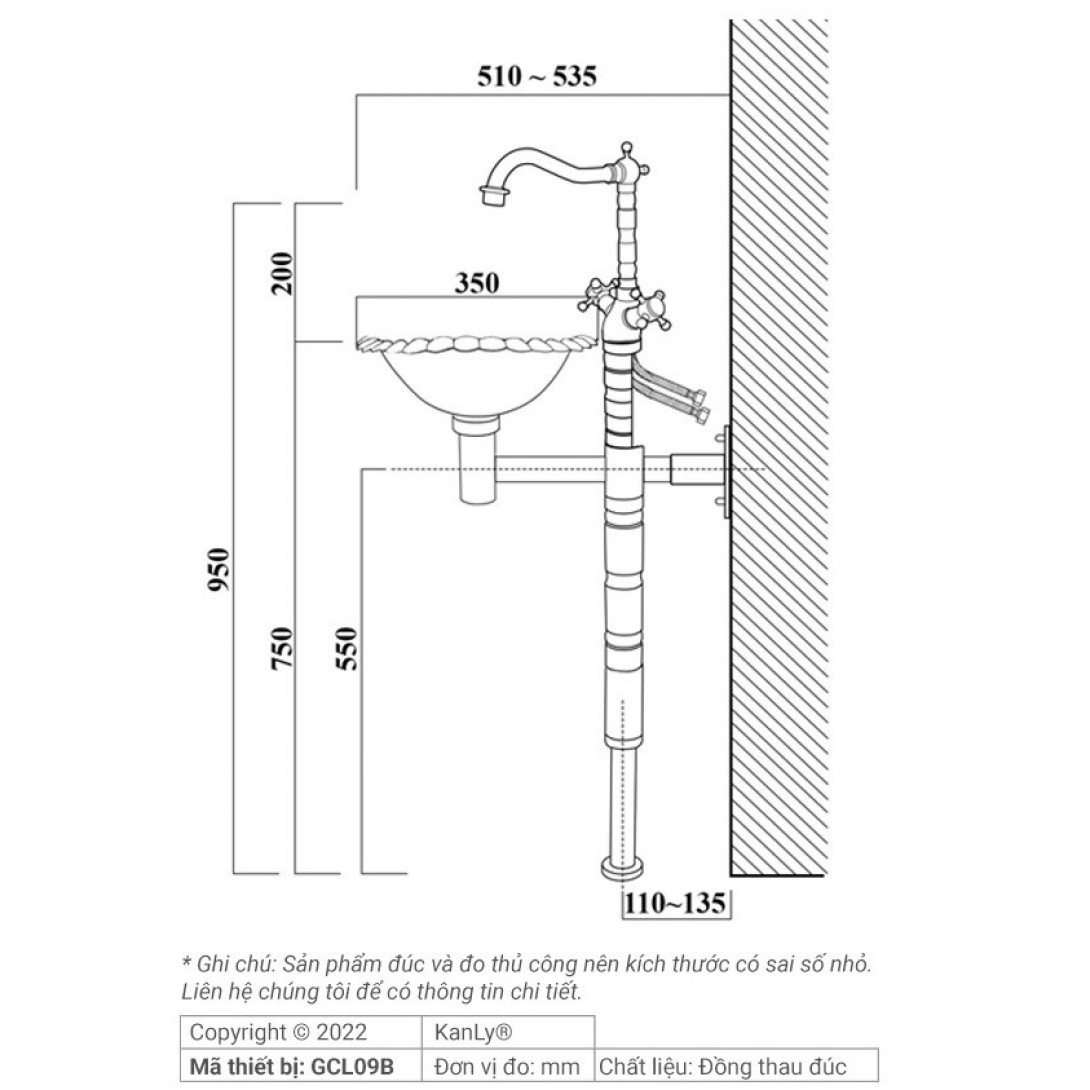 Bản vẽ kích thước bộ lavabo treo tường Kanly GCL09B bằng đồng