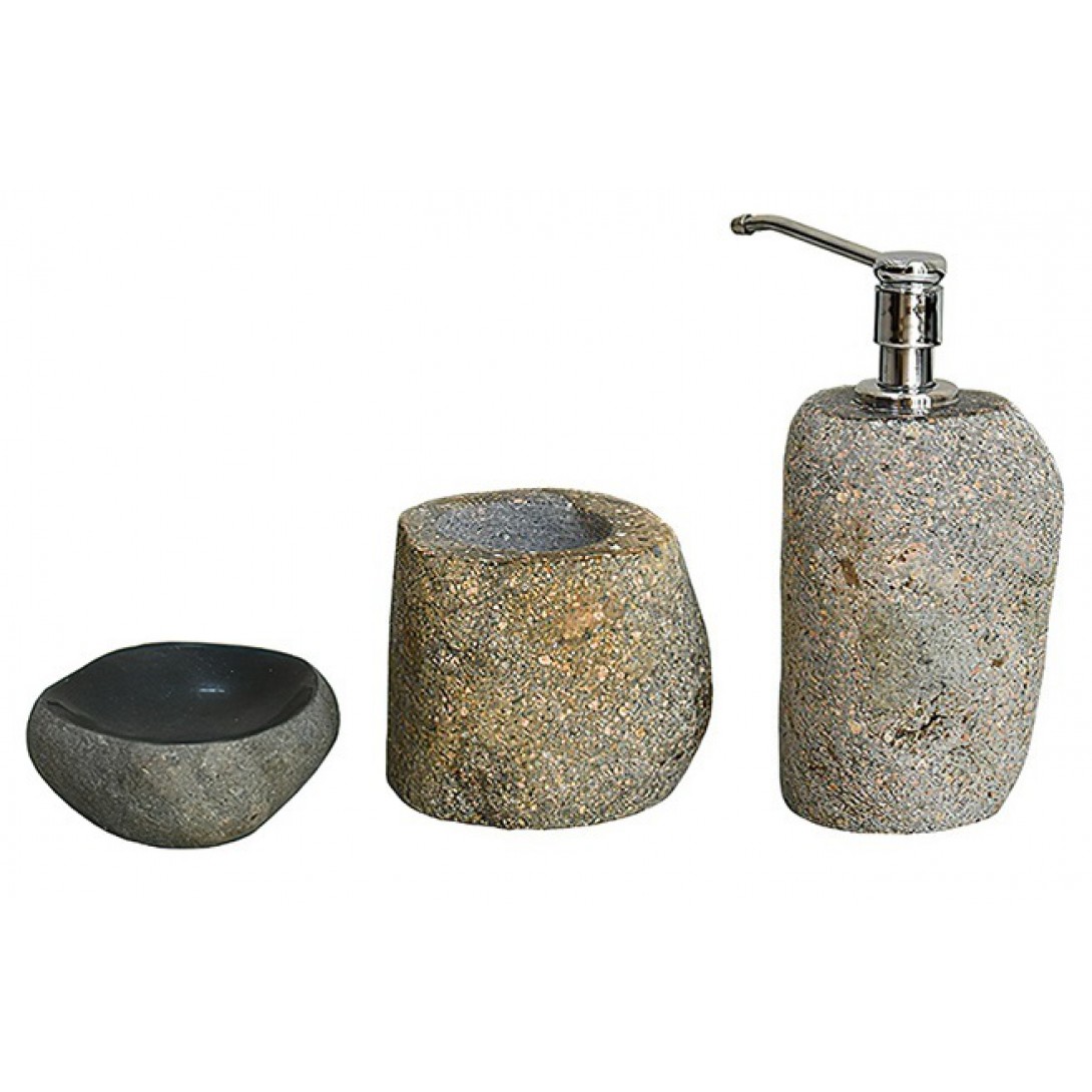 • Bộ bình, hủ, chai, lọ, cốc, đựng, đá cuội, bộ đồ dùng nhà tắm bằng đá cuội, được lựa chọn từ các bãi đá có kích kích thước và hình dáng phù hợp cho chế tác.