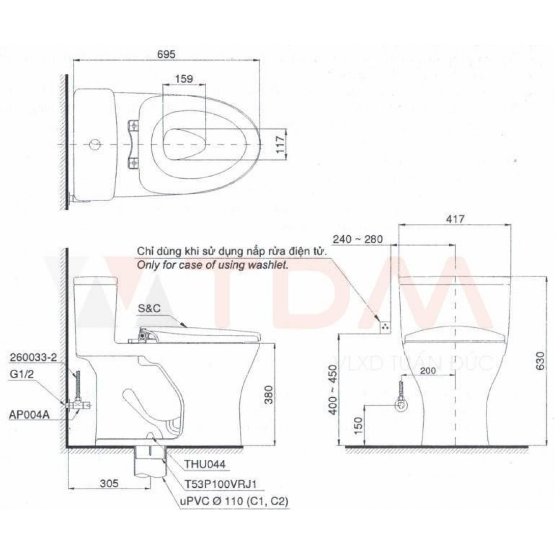 Bồn Cầu TOTO MS436T2 1 Khối Nắp TC393VS