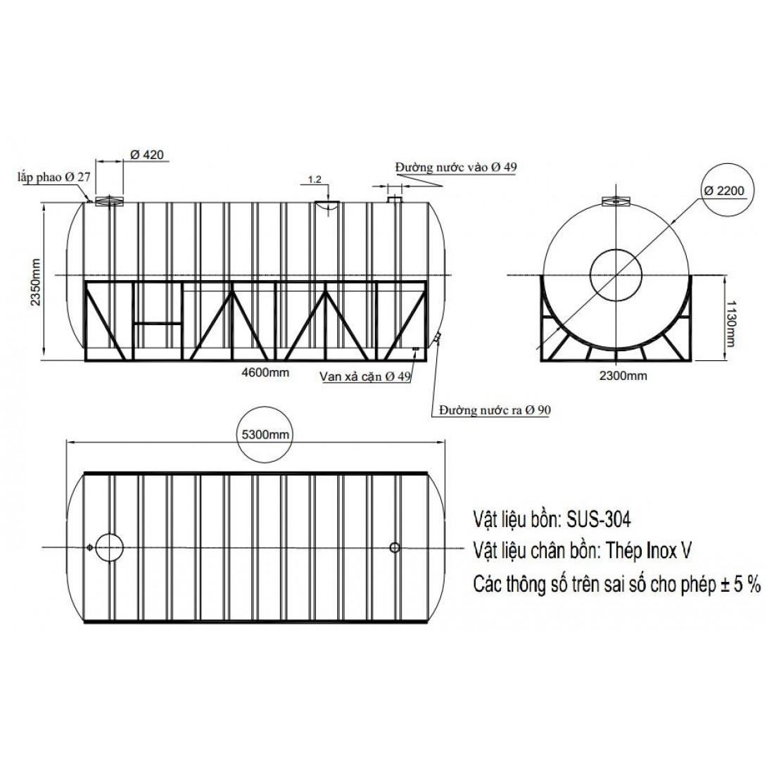 Bản vẽ téc nước inox 20 khối nằm Đại Thành SUS 304