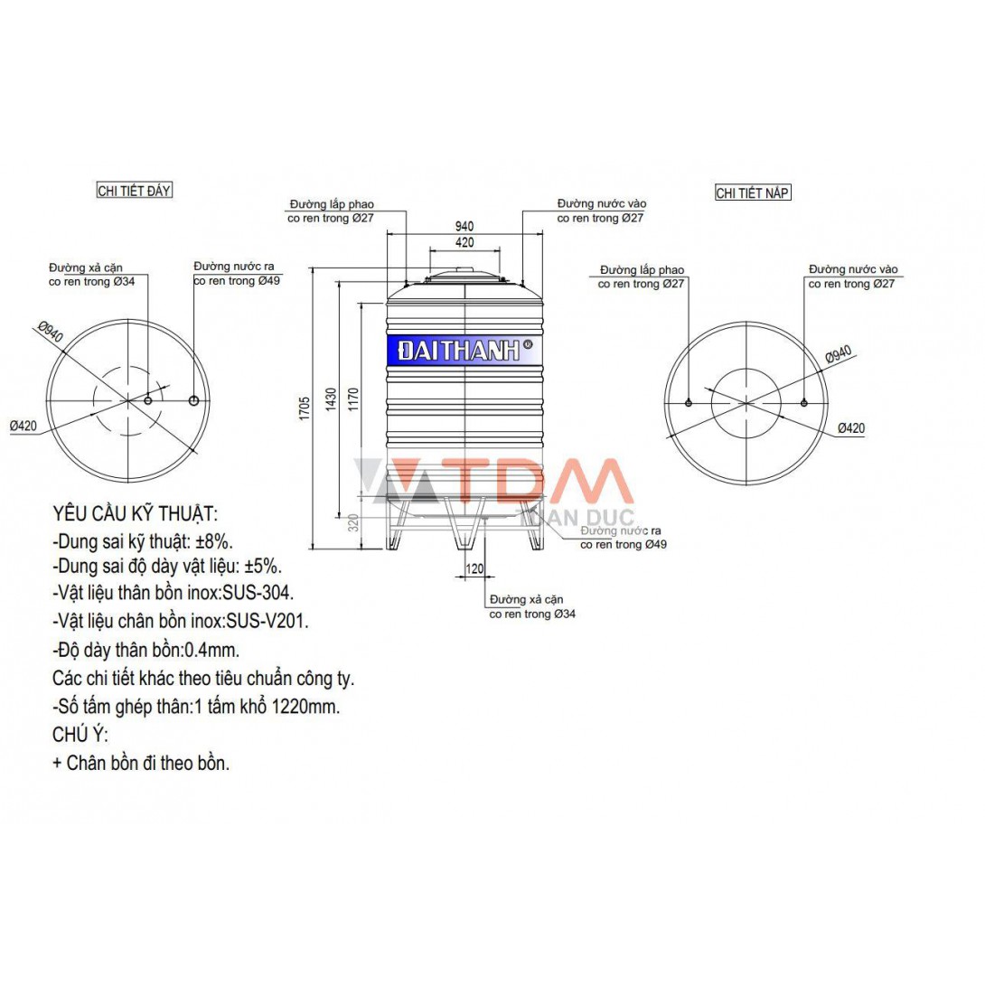 Bản vẽ téc nước inox 1000 lít Đại Thành SUS 304