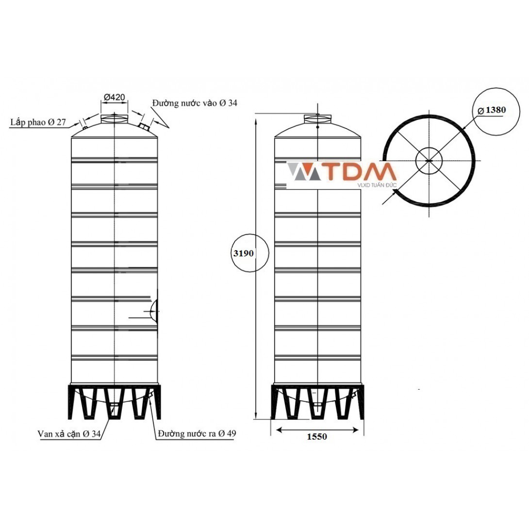 Bản vẽ téc nước inox 4500 lít đứng SUS 304 Sơn Hà phi 1380