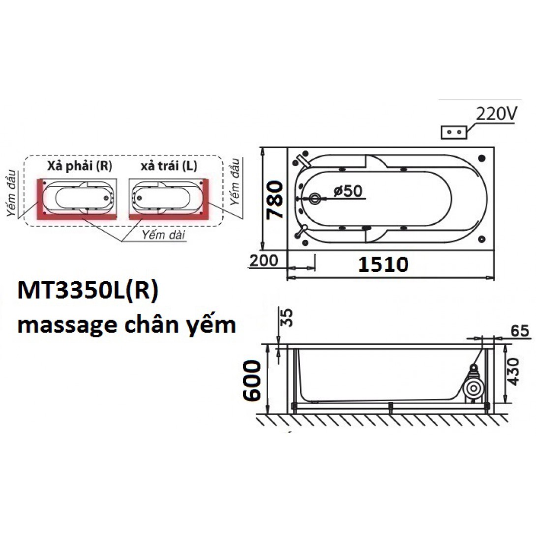 Thông tin cơ bản bồn tắm Caesar MT3350L/R massage chân yếm