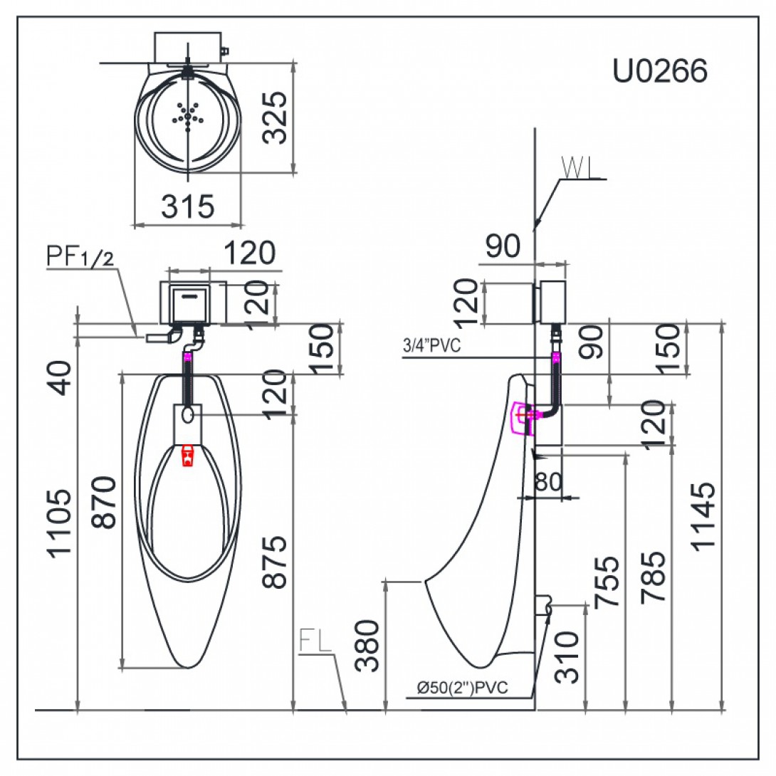 Bồn tiểu U0264 treo tường có thể lắp đặt với các van xả tiểu sau: A637, A648, A654, A673…