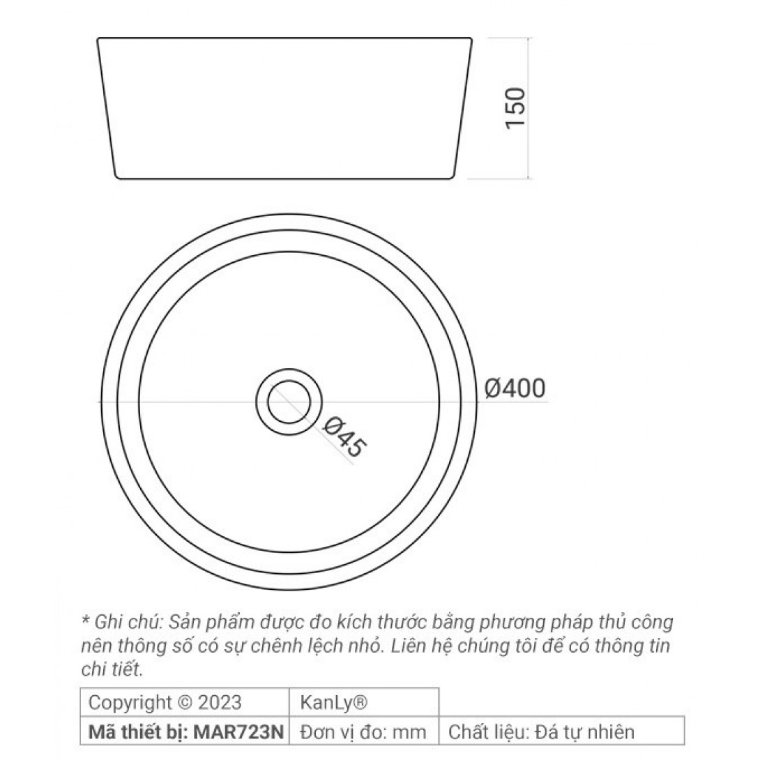 Bản vẽ kích thước lavabo đặt bàn MAR723N đá Kanly
