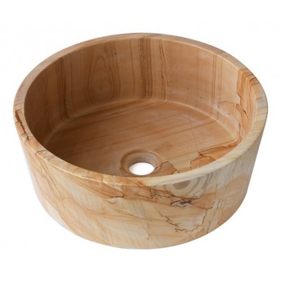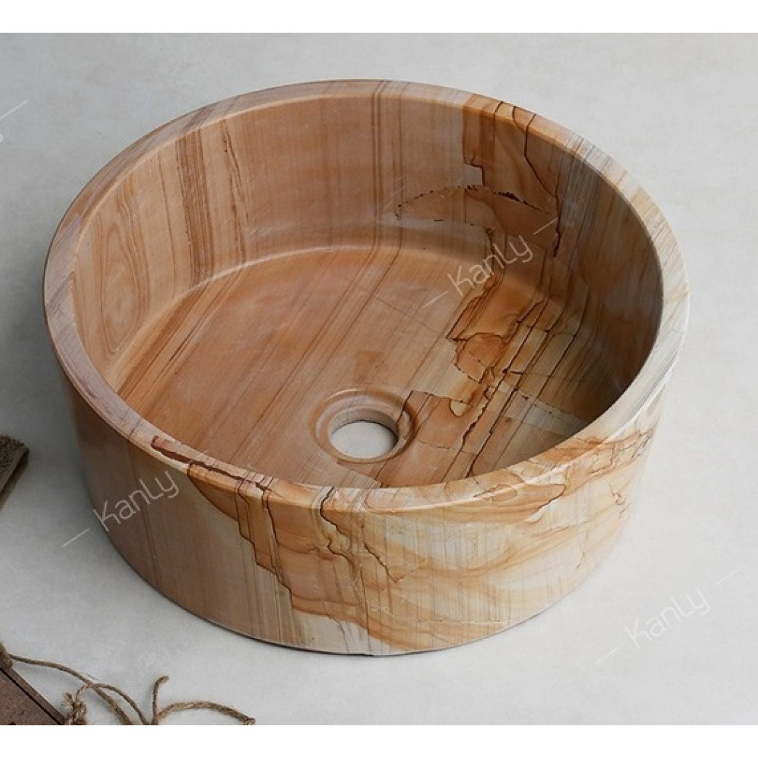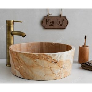 Đá tự nhiên này có tông màu vàng nâu kết hợp với đường vân nổi nhấp nhô, chạy dài trông như những thớ gỗ nằm trên bề mặt đá vậy, độc đáo và không trùng lặp, không gây nhàm chán như những chiếc chậu rửa được sản xuất công nghiệp hàng loạt.