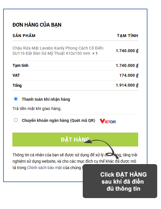 Quý khách chọn hình thức thanh toán : COD Trả tiền mặt khi giao hàng hoặc Chuyển khoản ngân hàng (Quét mã QR):