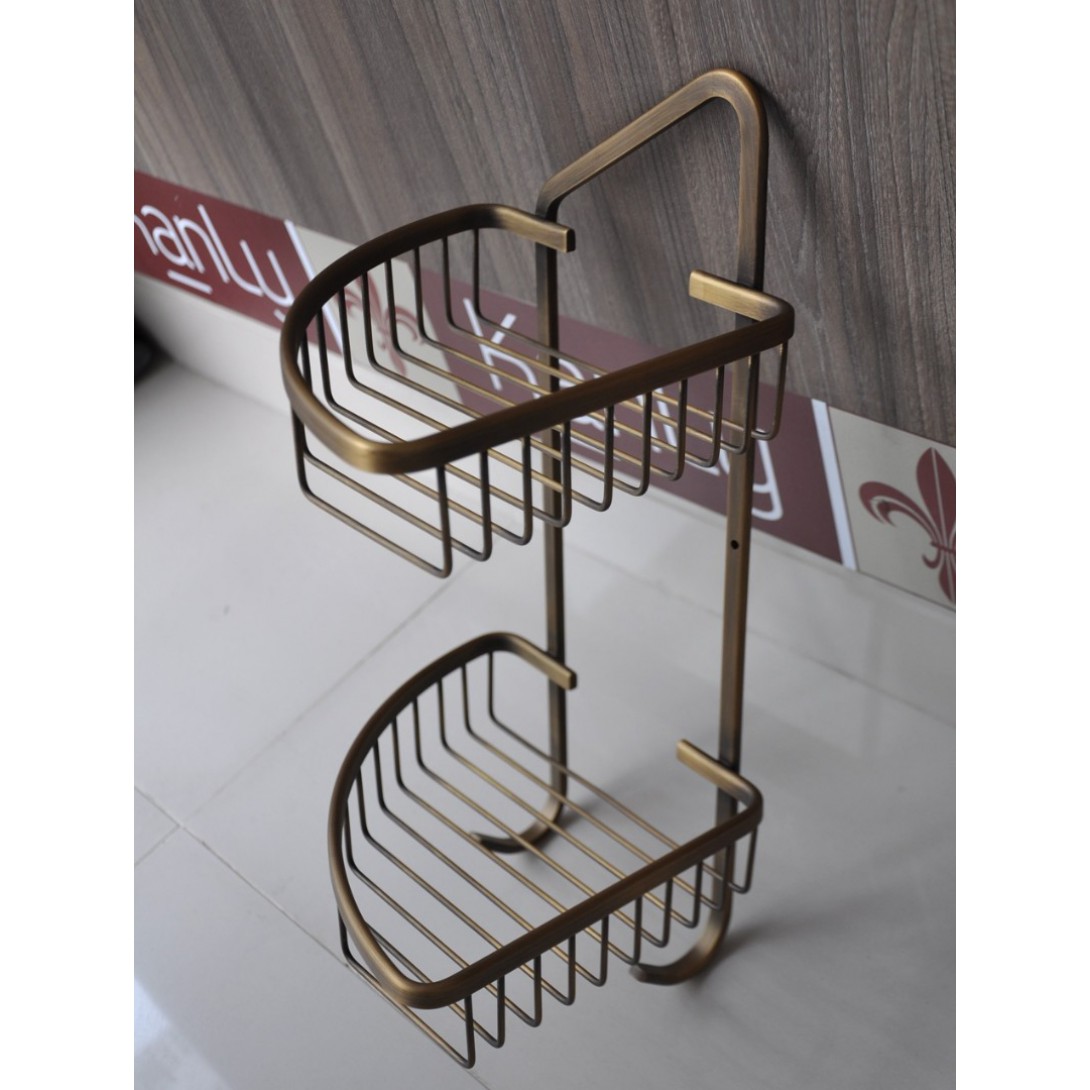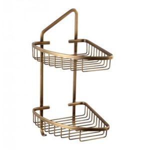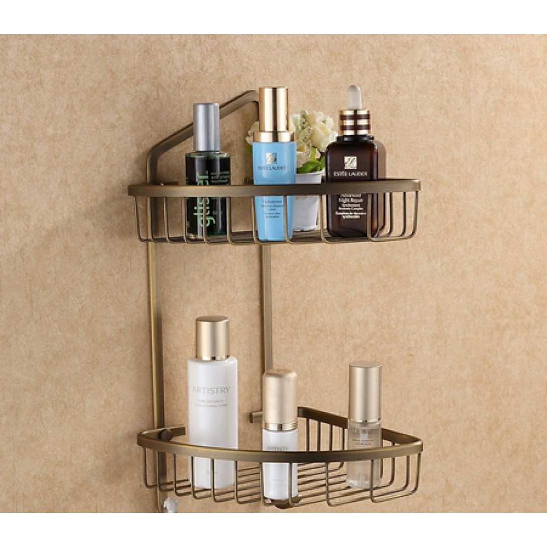 Kệ góc phòng tắm chất liệu bằng đồng thau, có 2 tầng, phù hợp tông nội thất nhà cổ điển, hoàng gia, quý tộc sang trọng hoặc nội thất tông kem, nâu, mộc.