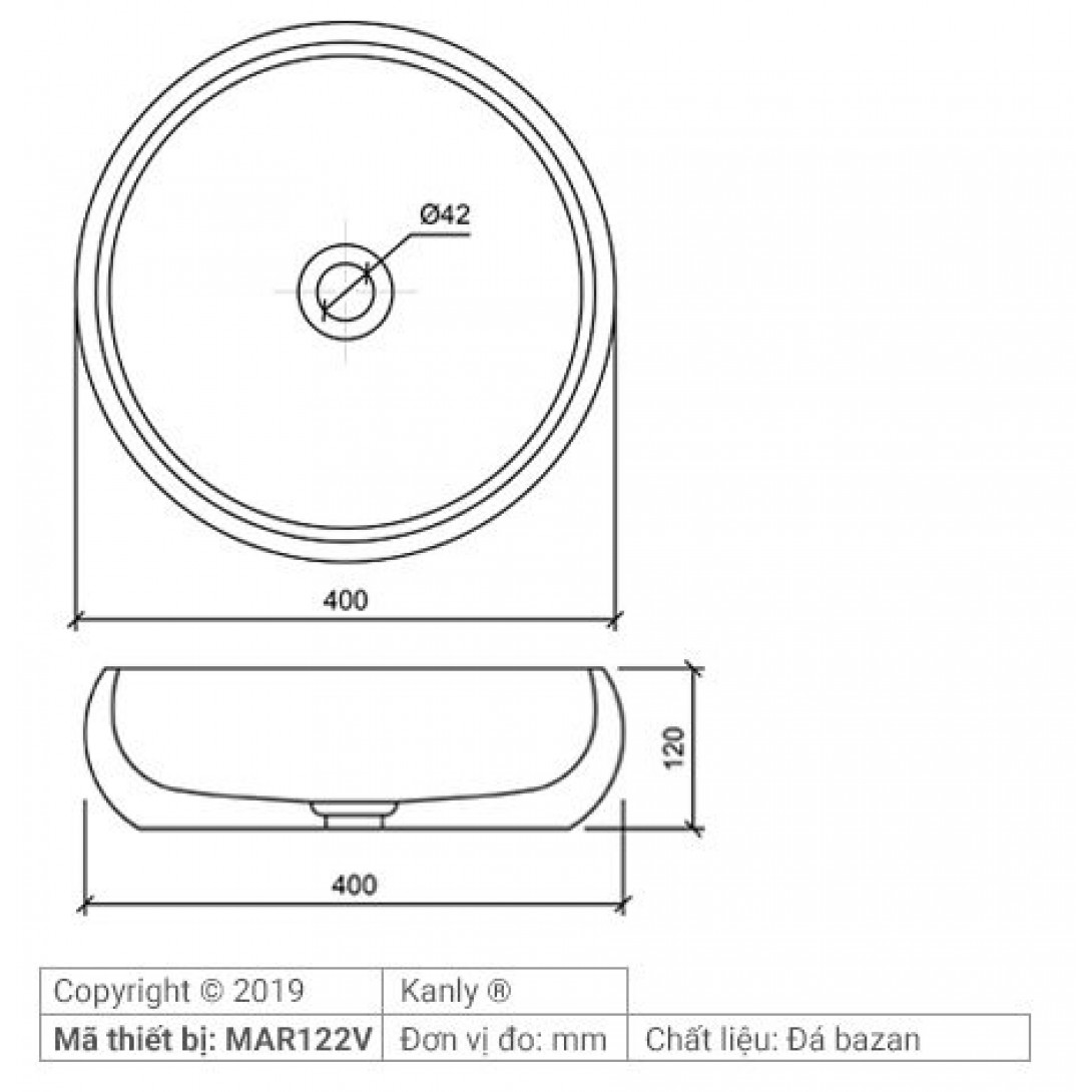 Bản vẽ kích thước chậu rửa mặt đá bazan Kanly MAR122V
