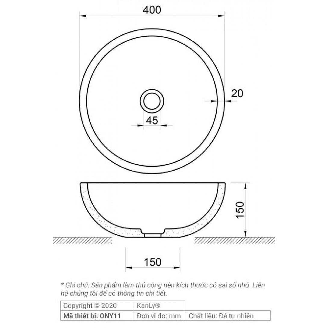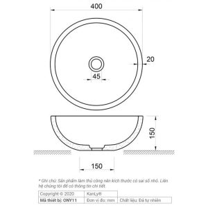 Bản vẽ kích thước chậu rửa mặt đá tự nhiên Kanly ONY11