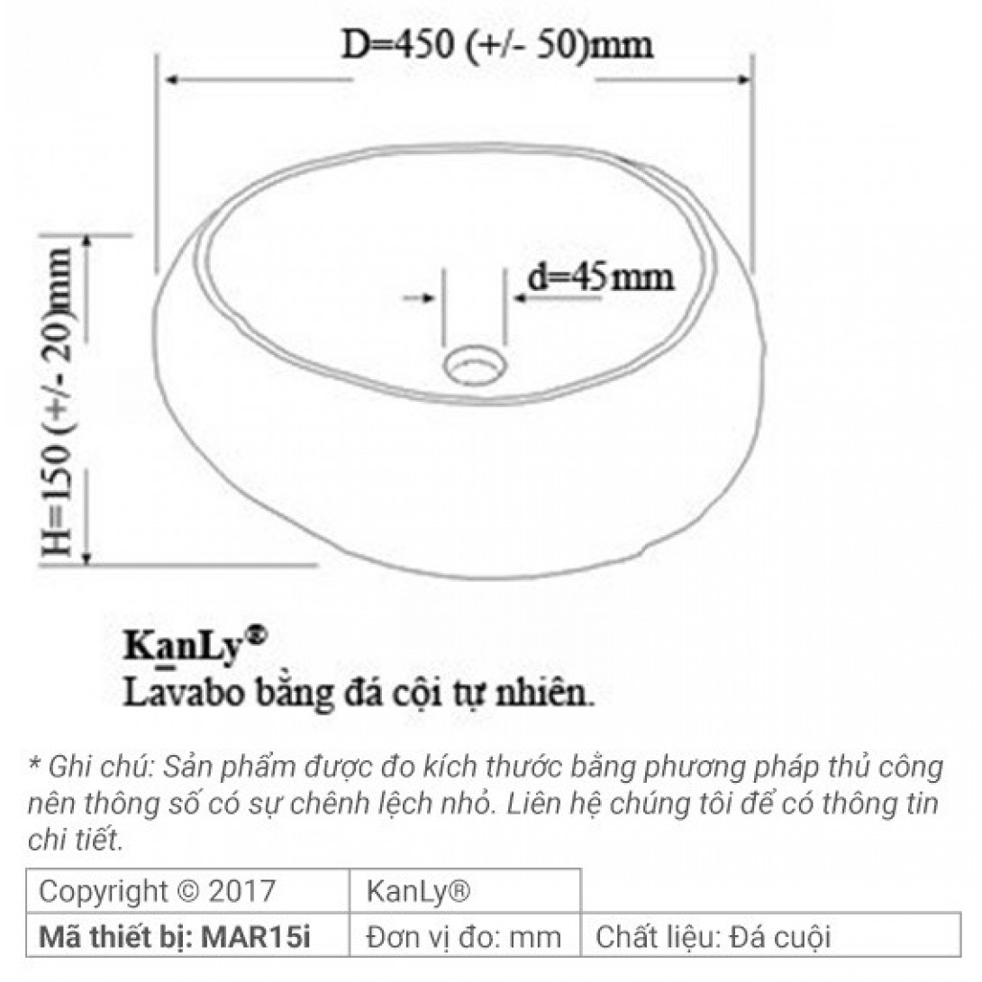 Bản vẽ kích thước chậu lavabo rửa mặt đá tự nhiên Kanly MAR15C