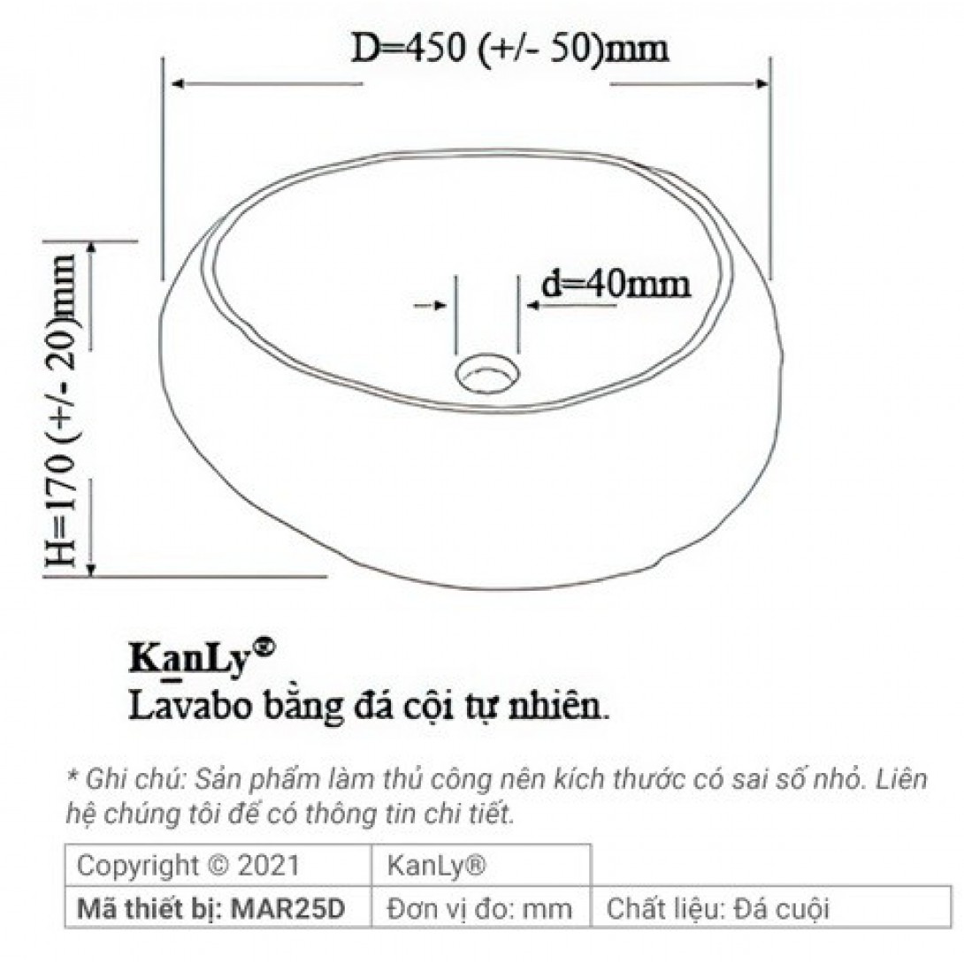 Bản vẽ kích thước chậu lavabo mặt đá tự nhiên Kanly MAR25D