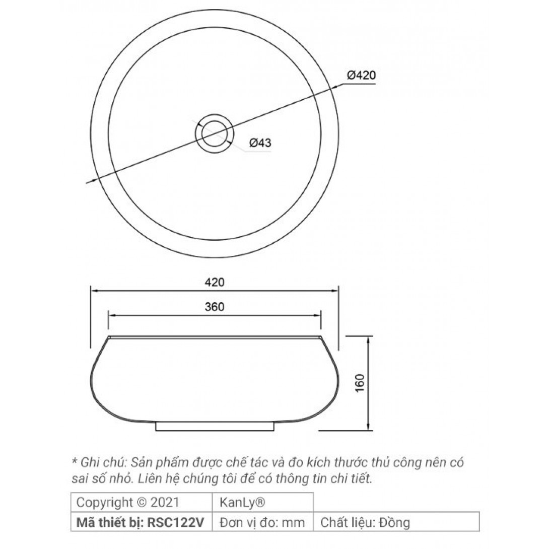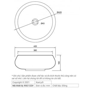 Bản vẽ kích thước lavabo đồng Kanly RSC 122V 420mm