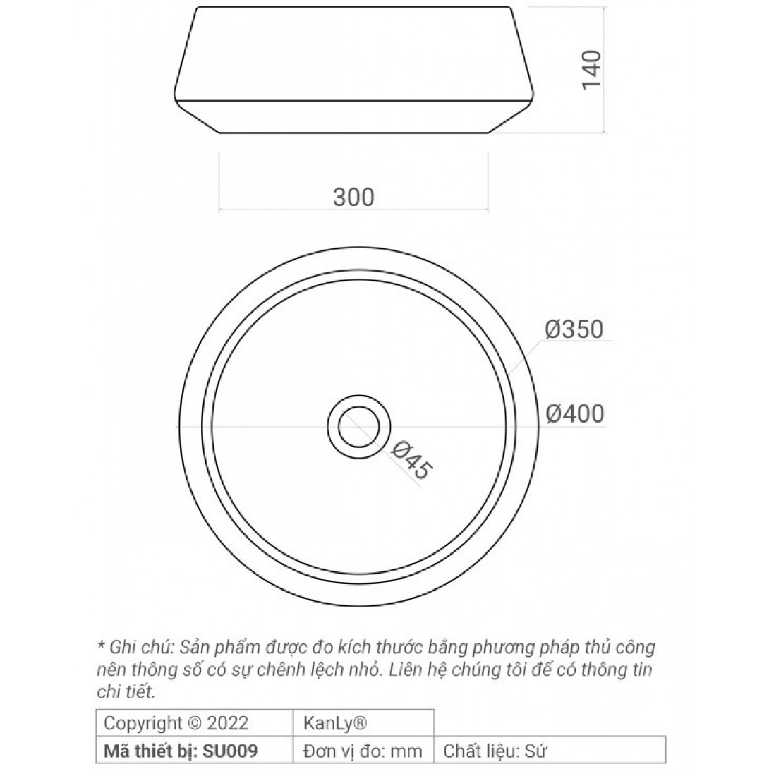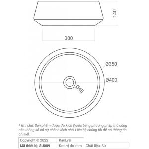 Bản vẽ kích thước chậu rửa mặt Kanly SU009 sứ in mỹ thuật