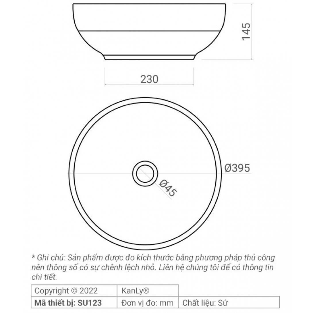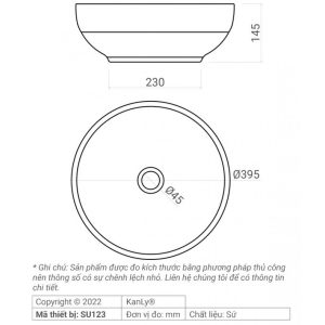 Bản vẽ kích thước chậu rửa mặt Kanly SU122 sứ in mỹ thuật