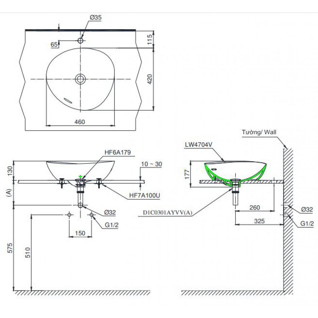 Chậu Rửa Mặt Lavabo COTTO C0225 Kate Bán Âm Bàn