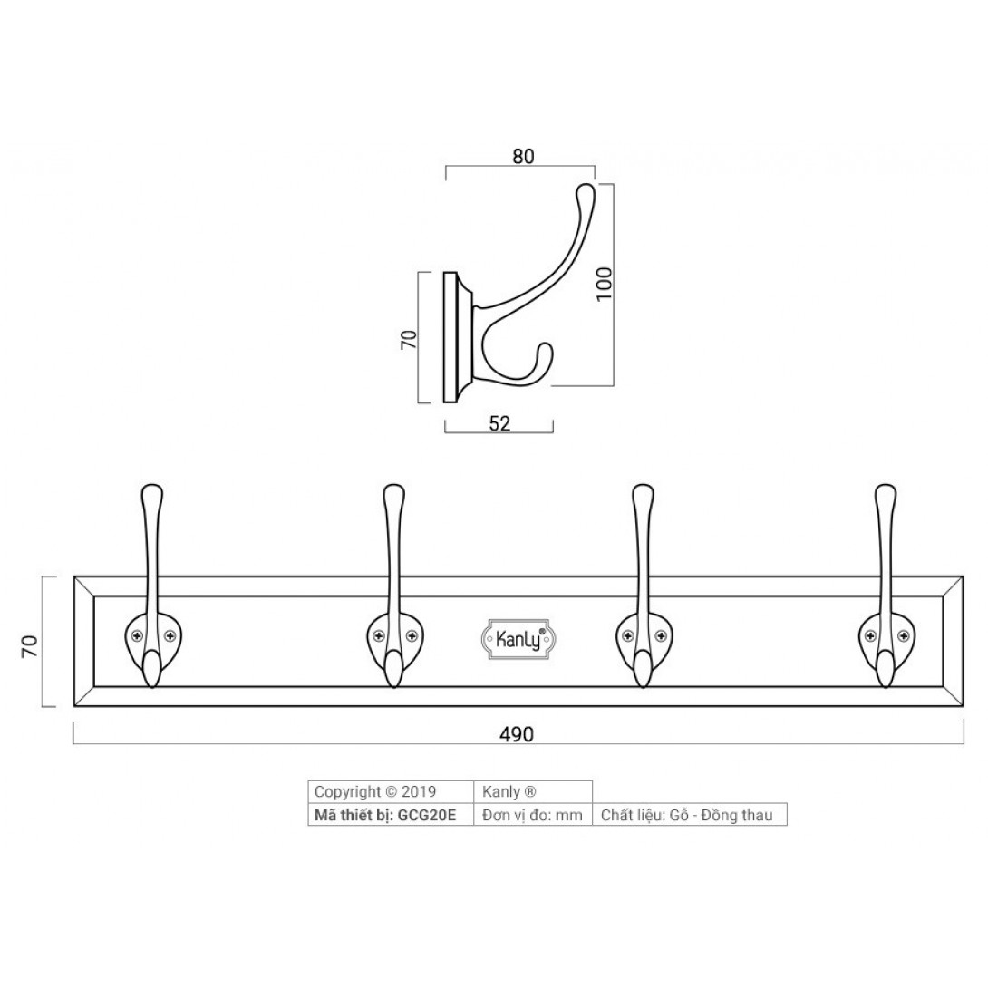 Bản vẽ kích thước móc treo áo Kanly GCG20E bằng gỗ