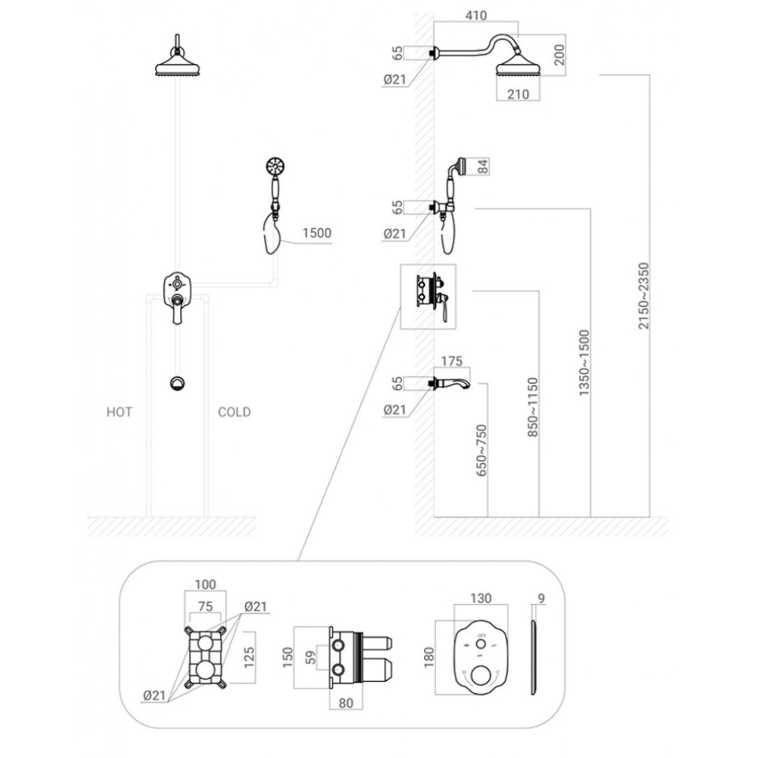 Bản vẽ kỹ thuật sen tắm âm tường Kanly GCS78B Nóng Lạnh Màu Đen