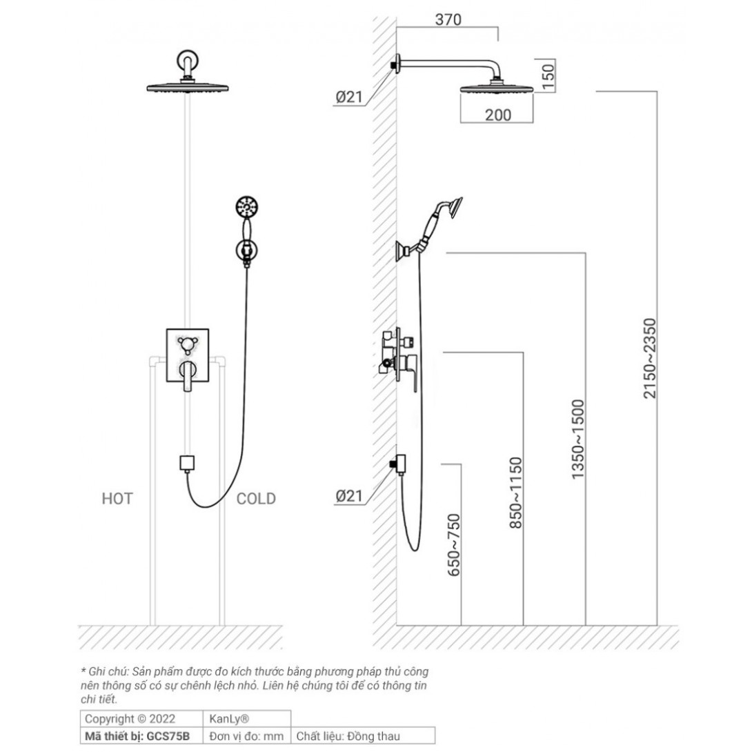 Bản vẽ kích thước sen tắm Kanly GCS75B đồng thau màu đen
