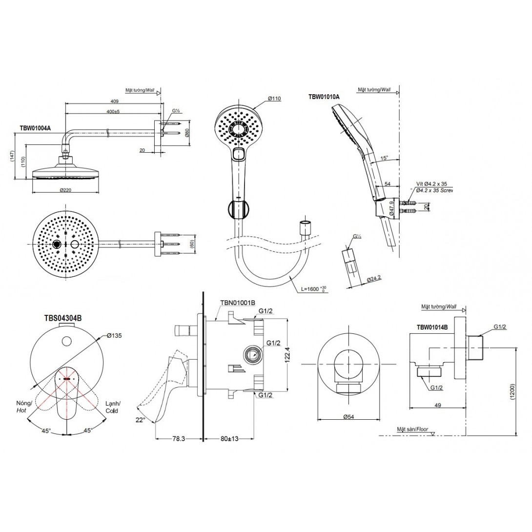 Vòi Sen Cây TOTO TBW08406A Nhiệt Độ Vuông 300mm