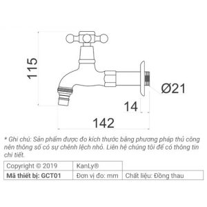 Bản vẽ kích thước vòi nước lạnh Kanly GCT01 gắn tường