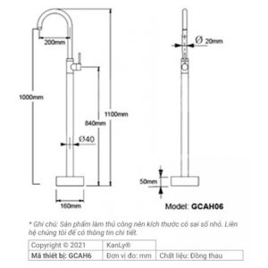 Bản vẽ kỹ thuật vòi sen xả bồn tắm bằng đồng Kanly GCAH6 đặt sàn